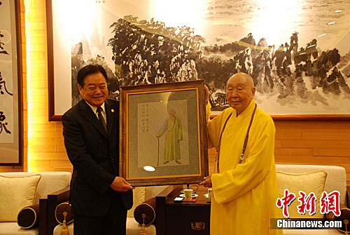 5月26日,四川省长蒋巨峰一行参访位于台湾南投县的佛教名刹中台禅寺。出生于四川营山县的惟觉大和尚与蒋巨峰叙家乡情,期盼两岸举办更多交流活动。图为蒋巨峰(左)向惟觉大和尚赠送列入四川非物质文化工艺的竹编画,画面是惟觉大和尚的肖像。中新社发 刘贤 摄