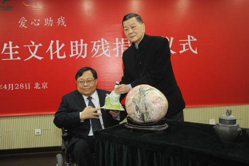 人民网北京5月4日电 日前,台湾著名收藏家王度先生向中国残联文化助残事业捐赠签字仪式在中国残联举行。他把多年收藏的近200件台湾玫瑰石及其它艺术品捐赠给中国残联华夏文化集团,用于支持文化助残事业。中国残联副主席、常务副理事长王乃坤向王度先生颁发了上海世博会生命阳光馆爱心大使荣誉证书;中国残联副主席、党组成员吕世明接受了捐赠;中国残联宣文部主任王涛,中国残联文化助残办公室负责人宋体金,中国残联华夏文化集团总裁助理刘海军等出席捐赠仪式。