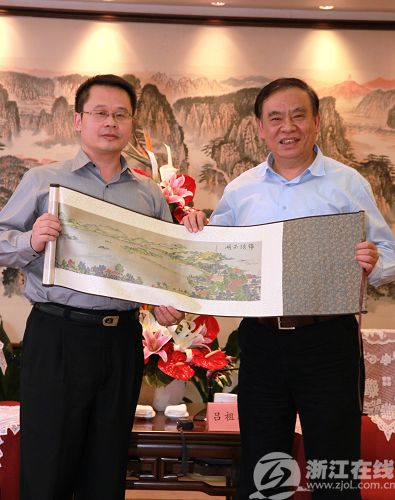 浙江省委副书记、省长吕祖善向台湾媒体联合采访团赠送礼品