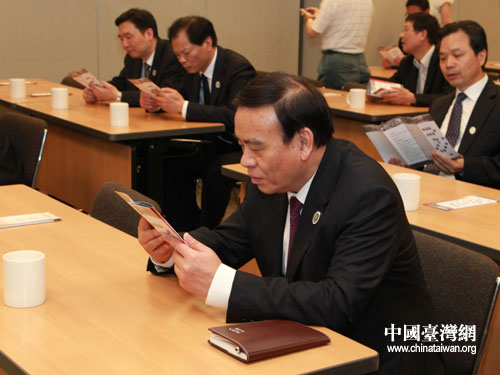 吕祖善一行参访台积电。图为吕祖善认真研究台积电介绍手册。(中国台湾网浙江通讯员王健 摄)