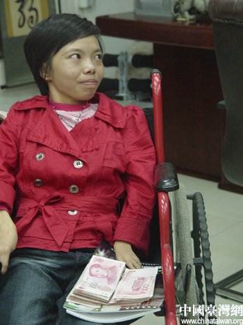 自尊自强的吴雪飞让人感动,在庆幸一双残疾人彼此恩爱的同时,也心痛因残疾,他们相走时却无法携手相牵的不便,正在蓝赞登先生办公室的贵阳市台协会副会长、贵阳市台农种养殖有限公司董事长李昭宏先生见状,当即掏出身上的五千元人民币,赞助他们买一对电动轮椅以改善他们的生活。蓝赞登先生也包了五千元红包给这对新人,希望他们永浴爱河、永结同心。