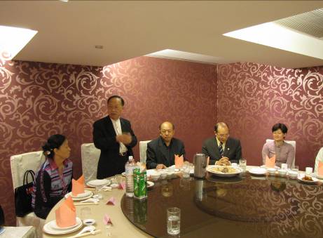 11月19日中午,饶德俊先生以个人名义在高雄市宴请了访问团一行,他在致欢迎辞中说,长期以来,我致力于两岸文化交流,2009年要组织台湾贵州同乡会及有关文化艺人的书画作品到贵州展览,今后要扩大到黔台经贸合作,将来还要考虑黔台科技合作,为贵州的发展和黔台合作做更多的事。在场的台湾贵州同乡会常务理事袁永寿先生在致辞中说,“饶德俊先生积极奔走,为促进两岸交流开创了新的局面。饶先生将会一如既往作出努力。” 饶先生是我省思南人,情系家乡,回报桑梓,在15日的晚宴上和当天,耄耋老人的他,还忙里忙外、热情接待,缓步走到我们面前敬酒,将名片分发给我们,嘘寒问暖,细致入微,让人感动,令人钦佩。23日早晨,在我们即将离开宾馆前往桃园机场乘飞机经香港转机回贵州之际,专门到宾馆为我们送行。由于知道我在贵州省黄埔军校同学会机关工作,还特地请台湾黄埔老兵林先生一同为我们送行。在贵州时,我曾多次见到饶先生,省黄埔军校同学会也曾多次接待过他。在我眼里,饶先生是一位平易近人的老人。