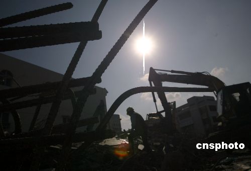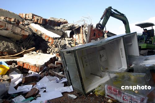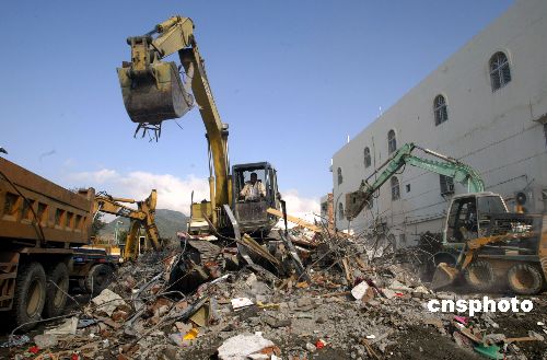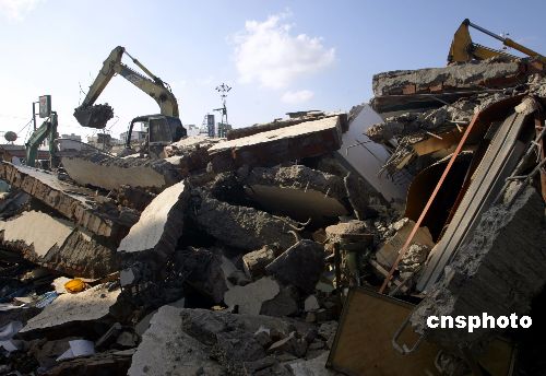 12月27日下午,台湾南部恒春地震受灾最严重的正兴家具行已经变成一片废墟,搜救行动已结束,大型机械车正在清理现场。该家具店主人方家在地震中共有两人不幸罹难。恒春镇仅有该家具店在地震中倒塌,当地镇公所认为房屋钢筋太少,而屋主则认为是当年镇公所挖水沟造成地基脆弱。中新社发 张炜 摄