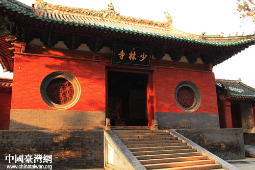 图为河南省嵩山少林寺 少林寺常住院中轴线现有七进院落,占地面积约36000平方米,保存宋、明、清建筑多座,是一处禅、武结合的文化圣地。山门的正门是一座面阔三间的单檐歇山顶建筑,它坐落在两米高的砖台上,左右配以硬山式侧门和八字墙,整体配置高低相衬,十分气派。门额上有清康熙帝亲笔所提“少林寺”三个大字,更添一道辉煌的景色。(中国台湾网 徐维彬 摄)