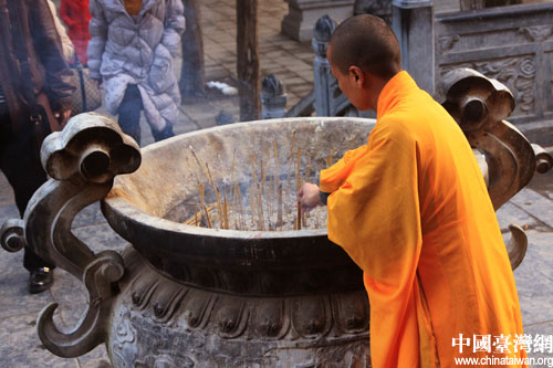 图为少林弟子燃香(中国台湾网 徐维彬 摄)