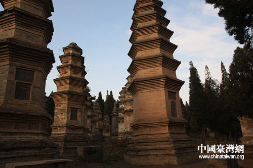 少林寺塔林,位于少林寺西约250米,是少林寺历代和尚的坟墓。有唐以来历代古塔230余座,是国内最大的塔林,有砖、石和砖石混合结构的各类墓塔。其中,唐塔2座、宋塔2座。金塔10座、元塔46座、明塔148座、现代和尚墓塔2座,余为清塔或时代不详者。有单层单檐塔、单层密檐塔、印度窣堵坡塔和各式喇嘛塔等。有正方形、长方形、六角形、八角形、圆形等,式样繁多,造型各异,是综合研究我国古代砖石建筑和雕刻艺术的宝库。(中国台湾网 徐维彬 摄)
