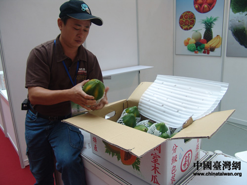“木瓜露面了”,台湾参展人员亲自检查负责用做展示的木瓜。(摄影:魏萌)