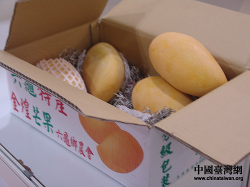 “不一样的超级大芒果!”,10公斤的包装箱里只能装下4个芒果!记者用手掂了掂,每个芒果都差不多有2、3公斤重。据了解,每种参加展览的农产品都经过了台农精心筛选。(摄影:魏萌)