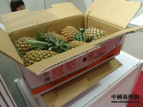 “凤梨报到!”,零关税“登陆”水果凤梨出现在了展台上。据了解,台湾水果凤梨与大陆水果菠萝虽然外貌相近,但还是有区别的,凤梨较之更为容易切片食用。(摄影:魏萌)