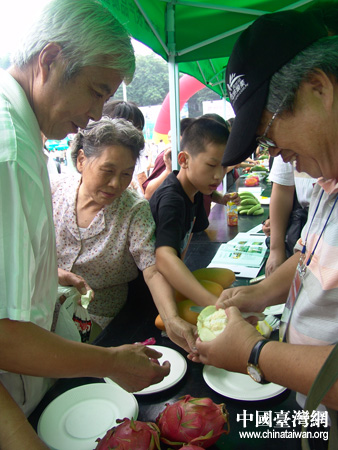 展示品尝活动吸引了众多人参与,主持人宣布活动正式开始后,一大群人很快就各自“奔赴”到选中的台湾农产品品尝台前。一位来自新疆的游客在品尝了台湾芒果后告诉记者,原来只在电视上看到过台湾水果,这次到南京来旅游,没想到竟然有机会品尝到。他说,芒果很甜,莲雾水分很足,台湾的水果味道果然不一样。