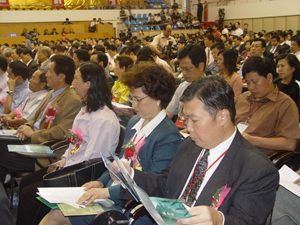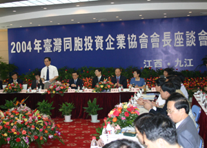 | 2004台湾同胞投资企业协会会长座谈会现场 | 据泰丰轮胎(江西)有限公司制造部经理马念慈介绍,尽管公司在2002年的产能已经高达300万套,但今年仍将追加投资2.3亿元更新设备,年底产能将提高到360万套,并争取跨入世界轮胎业前10强。与之相类似的是,“江西亚东”、“亚联包装”、“东盟实业”等台资企业也纷纷不约而同地表示,由于看好中部投资前景,将在江西增资扩股。