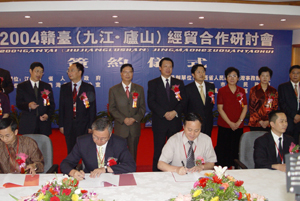 | 赣台经贸研讨会签约仪式 | 大陆投资环境及风险调查”报告显示,在被调查的150多个城市中,南昌市以综合指数居第十一的测评结果,首次登上“极力推荐”城市名单,成都也首次排到了“极力推荐”城市的前列,“极力推荐”城市中中西部城市数量首次达到两个。而仅仅在两年前,南昌在此公会公布的当年调查报告中,尚被列为“暂不推荐”城市。