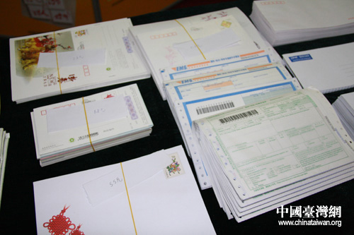 北京航空邮件交换站内,展示着用于两岸通邮的信封等(钟宝华 摄)