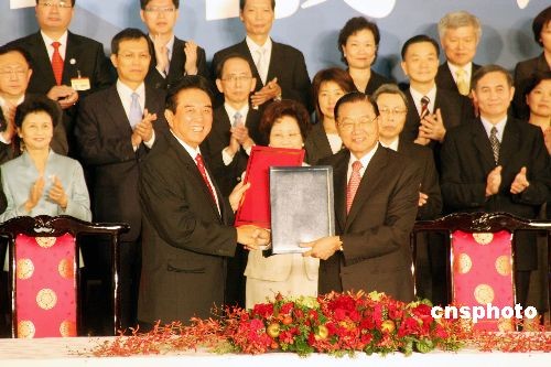 11月4日下午,海协会会长陈云林和海基会董事长江丙坤在台北签署有关两岸空运直航、海运直航、邮政、食品安全的4项协议。图为协议签署后,陈云林与江丙坤交换协议文本。 中新社发 黄少华 摄