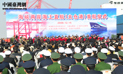中国台湾网12月15日消息 随着装满集装箱的“天福”轮长鸣一声汽笛驶向远方,太仓港至台湾港航线从此告别绕道日本石垣岛的历史,两岸同胞期待了30年之久的海上直接通航从此变成了现实。12月15日,太仓港与天津港、上海港、福州港同时举行了两岸海上直航首航仪式。