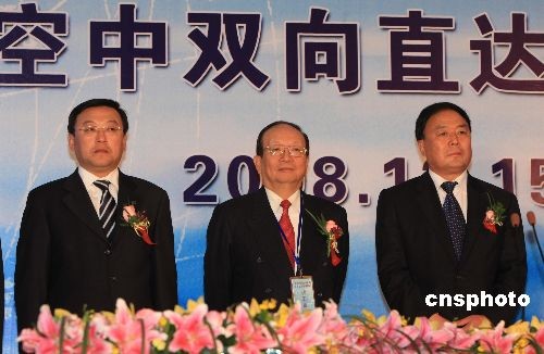 12月15日,台湾海峡北线空中双向直达航路正式开通启用,民航上海区域管制中心与台北区域管制中心首次建立两岸空管部门的直接交接程序,标志着两岸同胞期盼已久的直接、双向、全面空中通航变成现实。图为国民党副主席蒋孝严(图中)出席开通仪式。 中新社发 汤彦俊 摄