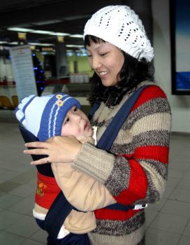 远嫁台湾的武汉人费莎女士带着8个月大的儿子乘直飞航班返汉 摄影:严越培
