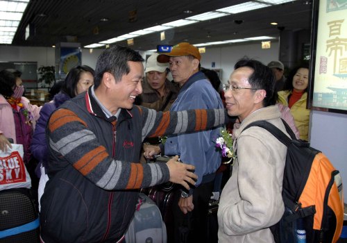 台商、武汉海派旅游公司总经理包东辉在机场迎接专程来湖北武汉的台湾百家采线团 摄影:严越培
