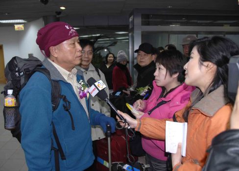 台湾旅客在机场接受新闻媒体的采访 摄影:严越培