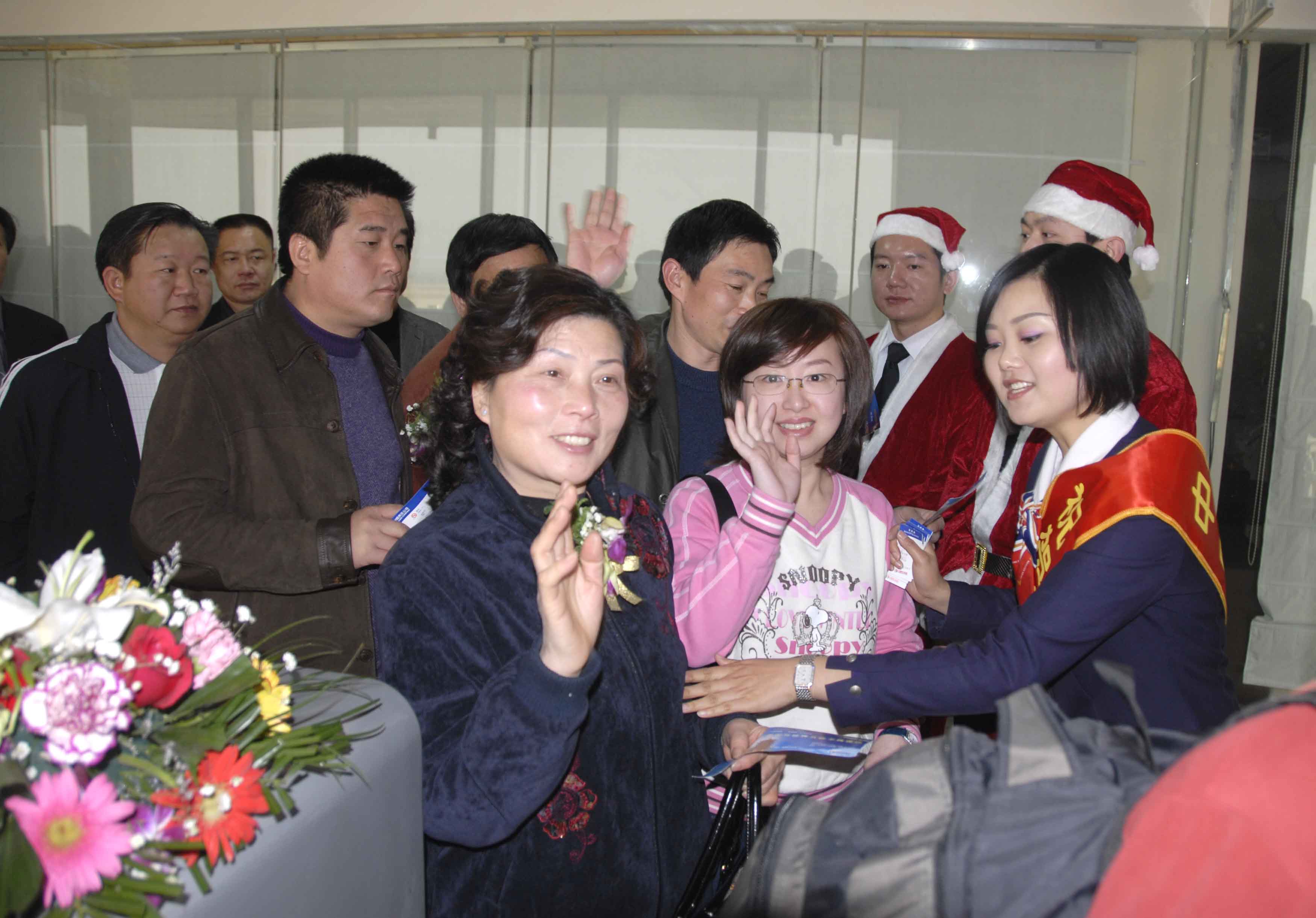 12月25日晚上8时许东航武汉公司领导在机场迎接执行汉台直飞的MU2087/2088航班机组成员 摄影:严越培