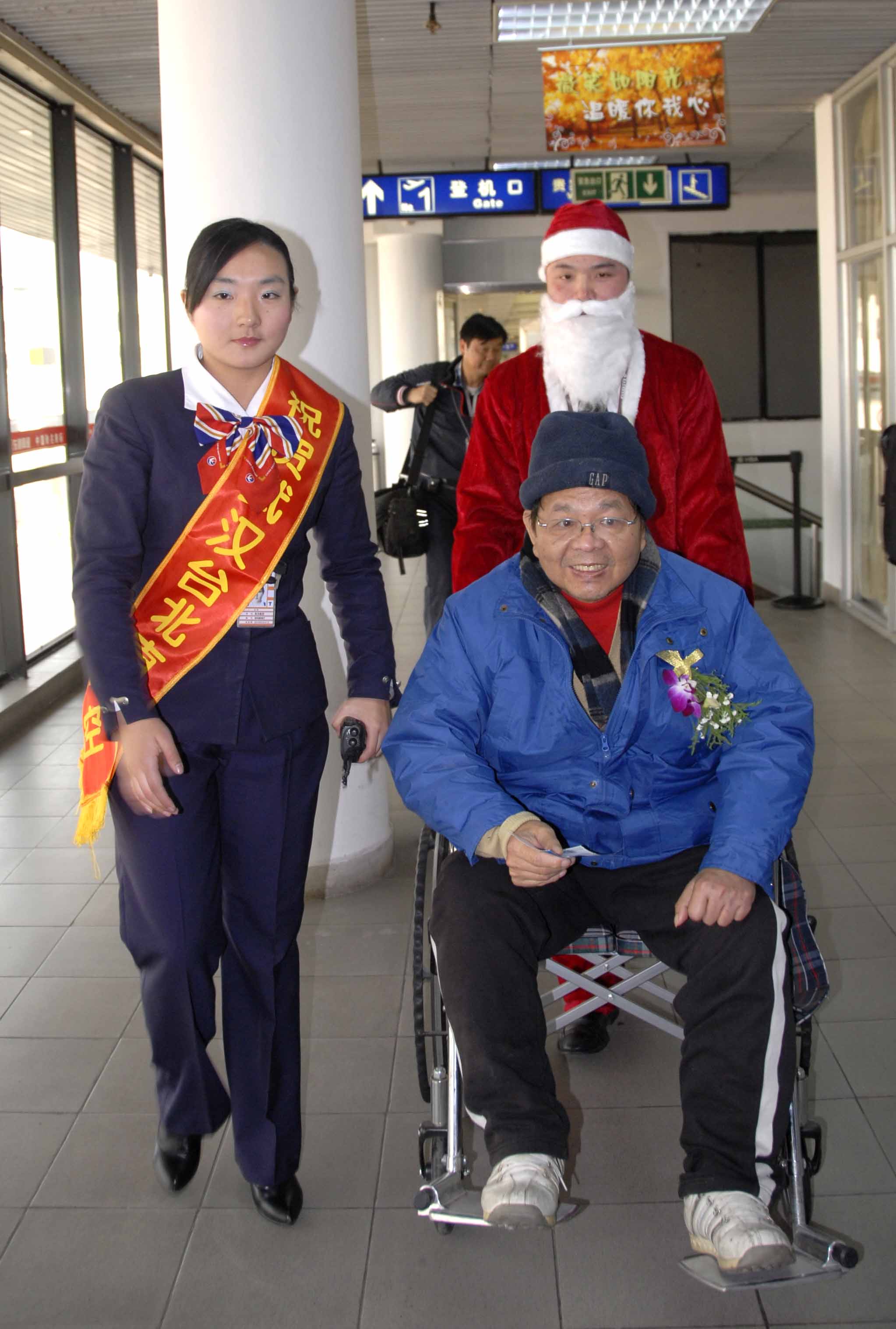 行动不便的范良明老人在机场服务人员的帮助下第一个进入直航班机 摄影:严越培