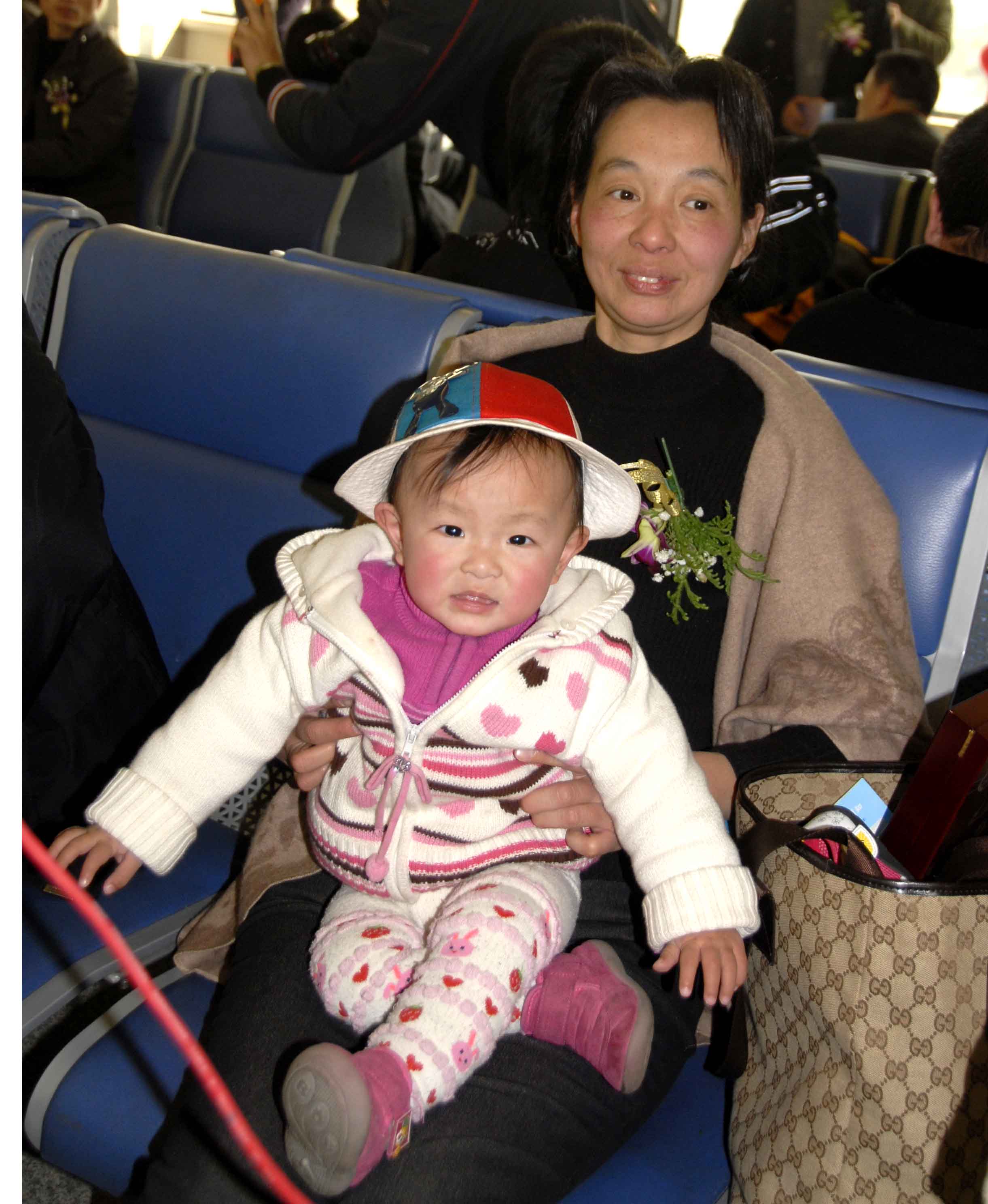 只有两岁的刘家莹是首航航班中年龄最小的乘客摄影:严越培