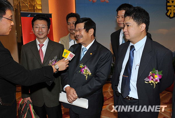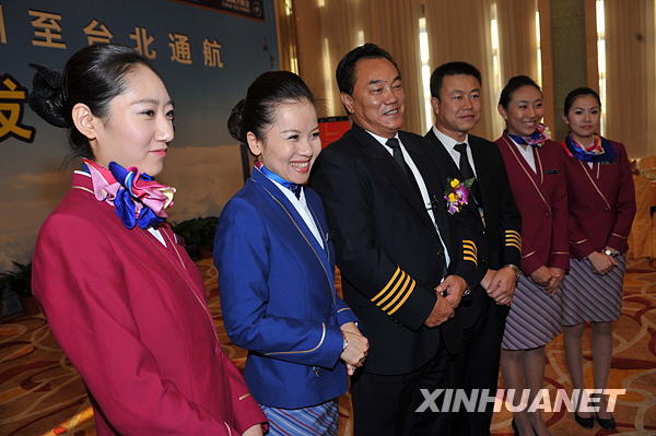 12月10日,南航首次直航台北的机长刘湘衡(左三)和乘务长石菁(左二)率领部分机组人员出席新闻发布会。中国南方航空公司将于12月18日执行两岸直航包机任务。南航深圳至台北直航包机为每周两班,逢周四、周六执行。新华社记者壮锦摄