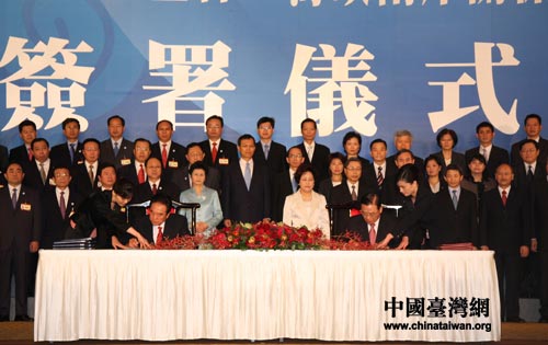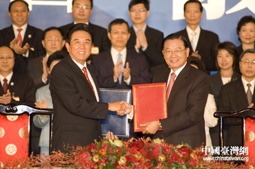 陈云林江丙坤交换协议文本。中国台湾网 田云鹏摄 中国台湾网11月4日台北消息 海协会会长陈云林与海基会董事长江丙坤今日下午签署海运、空运、通邮和食品安全等四项协议。(田云鹏)