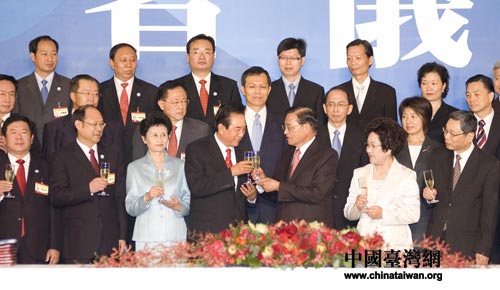 签约后陈云林和江丙坤碰杯庆祝协议签署成功。中国台湾网 田云鹏摄