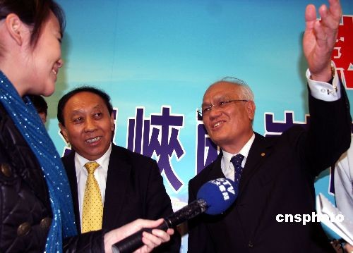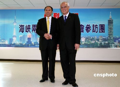 台湾海峡两岸航运协会(“台航会”)12月8日上午在台北与来访的海峡两岸航运交流协会(“海航会”)参访团座谈。图为海峡两岸航运交流协会理事长胡汉湘和“台航会”董事长、长荣海运董事长王龙雄在座谈会中。胡汉湘说,两岸航商争先恐后要求参加首航,两岸将同步行动,庆祝海运首航。中新社发 刘舒凌 摄