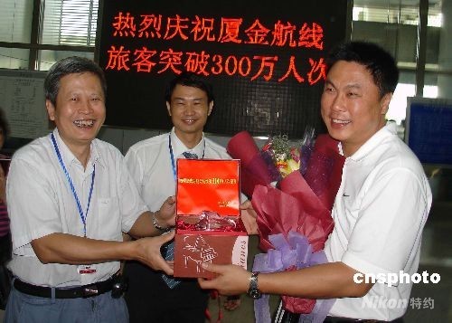 九月十九日,于二○○一年一月二日正式开通的厦金航线,累计运送出入境旅客人数突破三百万人次。厦门市台办、厦门口岸查验部门,向幸运成为第三百万名出入境旅客的在厦台商赖怡全(右)赠送精美纪念品,并献上鲜花。 中新社发 杨伏山 摄