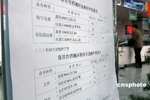 12月15日,海峡两岸全面直接通邮正式开通,目前,各项准备工作也已经就绪。当日起,两岸将通过空运或海运直航方式将邮件总包送至对方邮件处理中心,这标志着两岸全面、直接、双向通邮正式实施。届时,中国邮政集团公司将全面开办两岸邮政业务和邮政汇兑业务,大陆6万多个邮政网点原则上也将同步开展两岸函件、包裹、特快专递及邮政汇兑业务。图为北京一些邮局已专设台湾邮件处理通道。 中新社发 郑雄增 摄