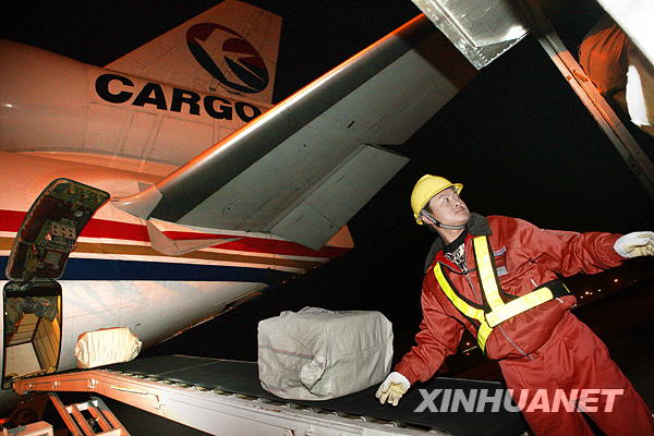 12月16日晚,一名浦东机场工作人员向CK261次班机机舱装载货物。新华社记者 裴鑫摄