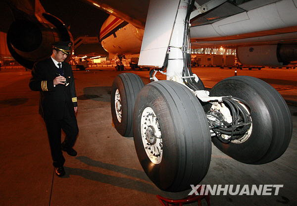 12月16日晚,货运包机的一名机组人员在起飞前检查起落架。新华社记者 裴鑫摄