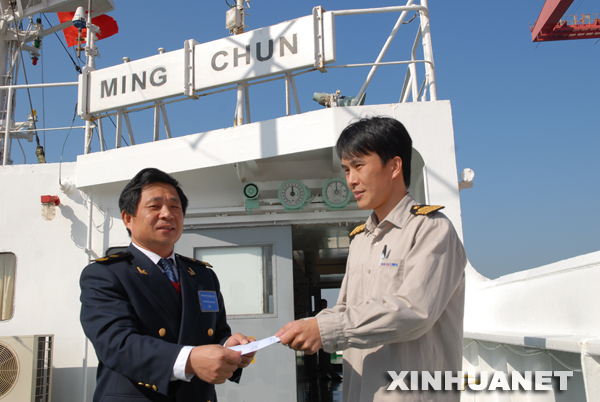 12月17日,厦门海事部门工作人员为“明春”轮船长颁发入港手续办妥通知单。 新华社发