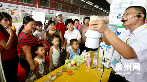 9月6日—8日,首届海峡两岸(泉州)农产品采购订货会在闽台农产品市场举行,一名台商在推介产品。