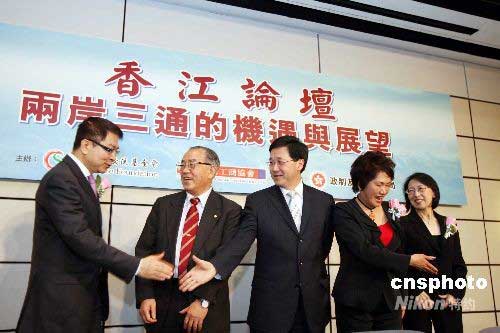 由香江文化交流基金会主办的“香江论坛---两岸三通的机遇与展望”,六月二日在香港会展中心举行。图为香港政制及内地事务局长林瑞麟(中)与主持人香江文化交流基金会主席江素惠(右二)欢迎与会者。中新社发 洪少葵 摄