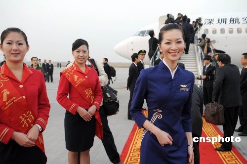12月15日早晨,一架深航班机满载160名旅客由深圳宝安国际机场起飞首航台北松山机场,两岸常态包机直航从此营运,极大方便深圳、东莞、惠州及周边地区的台湾旅客。图为深航台湾籍空姐曾怡纶担任两岸包机直航航班乘务长。 中新社发 陈文 摄