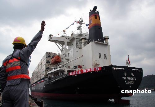 12月15日上午,台湾行政当局负责人刘兆玄率同“陆委会主委”赖幸媛、海基会副董事长高孔廉、“交通部次长”游芳来与台湾知名航商负责人共同出席“两岸海运直航基隆港首航仪式”。图为码头工人在港口向正要启航的阳明海运“宇明轮”挥手致意。 中新社发 刘舒凌 摄