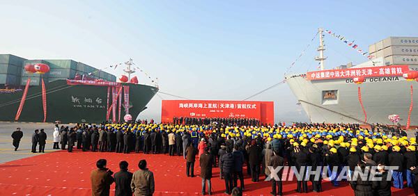同日11时,在漫天飞舞的礼花和彩球的掩映下,万吨巨轮“新烟台”号满载装有机械设备、建筑材料、化工产品、食品等的集装箱,离开天津港,驶向台湾基隆,执行穿越台湾海峡的两岸海上直航首航,航程预计48小时,比过去绕航大约节省1天时间,可节省燃油140吨。