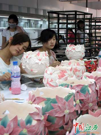 在法蓝瓷景德镇生产基地,技术工人正在熟练地进行绘色工序。(江西网 王建亮 摄)