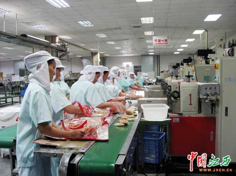 在上工前,工人们要经过三道清洁关的检验,方可入内操作。(江西网 王建亮 摄)