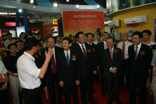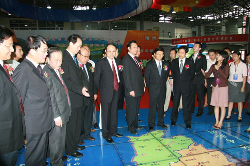 中国台湾网8月30日江西消息 2007赣台经贸研讨会于8月28日-9月2日在江西南昌举办。有千余台商及台湾商界人士与会。29日上午举行了“赣台经贸合作成果展”启动仪式。该图为工作人员向领导和嘉宾介绍产品情况。(摄影:邵填)