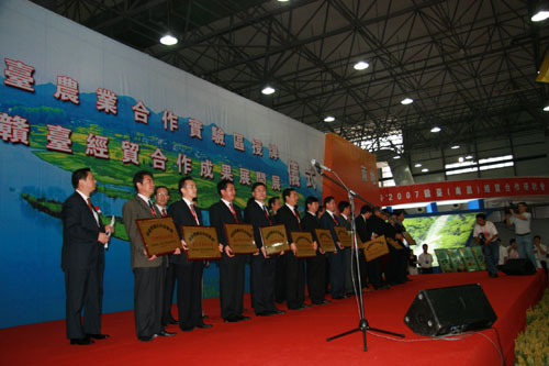 中国台湾网8月30日江西消息 2007赣台经贸研讨会于8月28日-9月2日在江西南昌举办。有千余台商及台湾商界人士与会。29日上午举行了“赣台农业合作试验区”揭牌仪式。该图为成果展现场。(摄影:邵填)