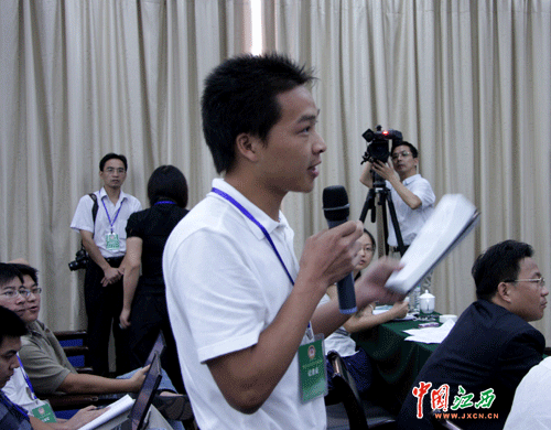 中国江西新闻网记者在记者见面会上提问。(江西网记者 何淳勇 摄)