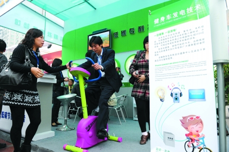 昨日,人民广场,第四届中国专利周上展出的健身发电车。 记者 邹飞 摄