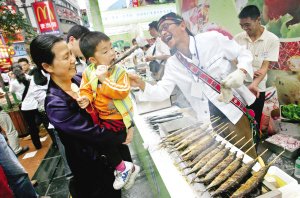 “首届台湾美食风情展”,一小孩迫不及待地品尝着手中台湾烤鱼的美味    资料图 李文彬 摄