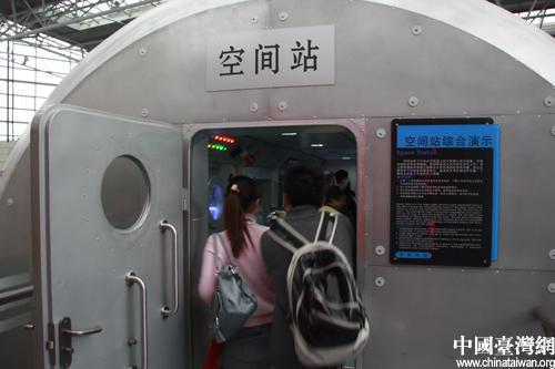 两岸记者参观科技馆内的仿真空间站。(中国台湾网 程轶文摄)