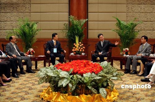 6月26日,国家旅游局副局长杜江在北京国际饭店会见台湾中部四县市负责人,台中市市长胡志强、彰化县县长卓伯源、台中县县长黄仲生、南投县农业处处长陈朝旺。 中新社发 廖攀 摄