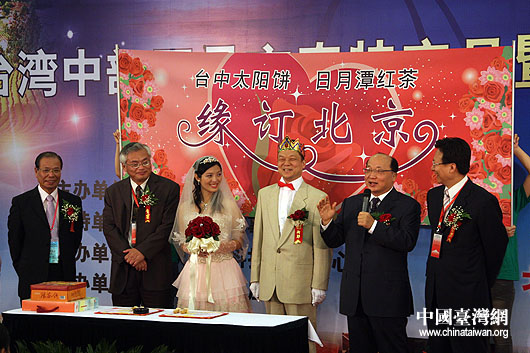 “台湾中部四县市农特产品暨观光展览”6月27日上午在北京国际会议中心开幕,台中太阳饼与日月潭红茶在开幕式上上演“缘订北京”联姻秀,四县市长登台主婚。(中国台湾网 钟宝华 摄)